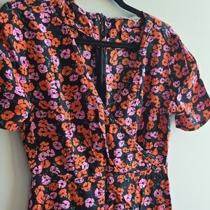 This elegant floral dress features a striking black, pink and orangy red floral design, perfect for any occasion. The vibrant colors and flattering fit make it a must-have addition to your wardrobe. It's a faux wrap with a beautiful button down detailing at the front.