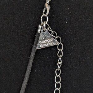 This necklace by Nintendo features a blue ocarina pendant from the Legend of Zelda video game. The necklace has a medium-length black cord with an adjustable lobster clasp closure made of a silver tone metal. The pendant is made of a blue plastic with black dots and a grey band with a yellow triforce near the bail. There is also a triangular (triforce) stamped maker's tag near the clasp. The necklace has normal wear, including superficial marks in the pendant and maker's tag, but is still very wearable. Unfortunately, the pendant is solid and is not an actual (playable) ocarina.