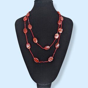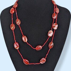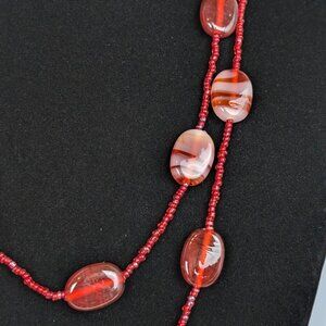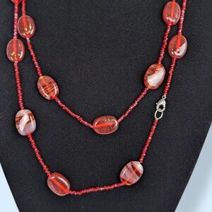 This necklace is long enough to be worn doubled (as in the photos) and has a silver tone lobster claw closure. The necklace is beaded with teeny, little red beads and accented with larger red and white streaked Murano-style beads. The necklace has normal wear but is in good condition overall. There are no chipped, cracked, broken, or missing beads.