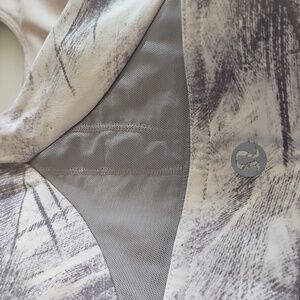 Elevate your workout wardrobe with this stylish sports bra featuring an abstract print in cream and gray tones. Perfect for comfort and support during any activity.