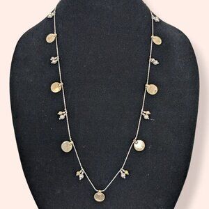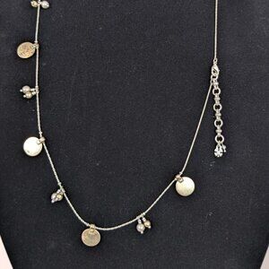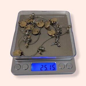 This necklace is made of a silver tone metal and has an adjustable lobster clasp closure. The chain is thin with tight links and features alternating gold tone metal discs and dangling beads (2 at a time). There is some wear in the metal but nothing that affects wearability.