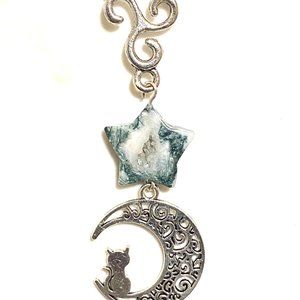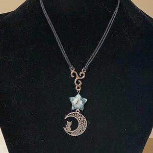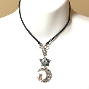 Natural Gemstone Tree Agate Star + Cat on the Moon Cord Necklace