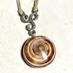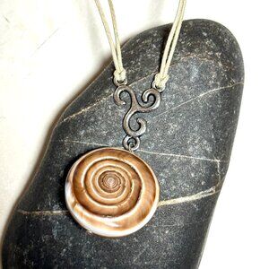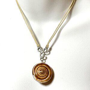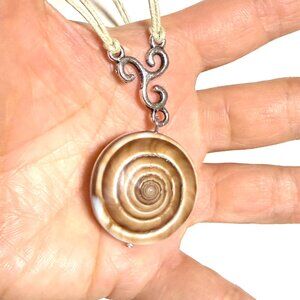 Embrace the essence of the ocean with this captivating natural shell cord necklace. The necklace features a stunning circular shell pendant with a mesmerizing spiral pattern capturing the beauty of nature's design. A sleek, beige cord gracefully supports the shell, fastened with a silver-tone clasp that provides a secure fit. The swirled texture of the shell contrasts against the smooth, beige necklace cord, making for a piece that's both organic and polished. This necklace is a chic statement piece, perfect for adding a touch of seaside serenity to any outfit.