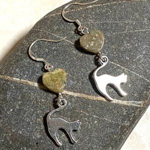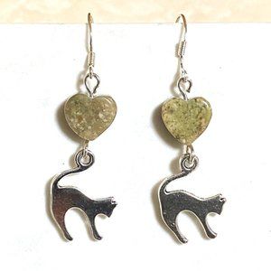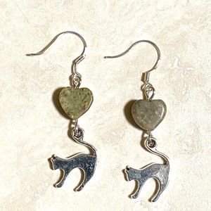 2/$20, Natural Unakite Stone Heart + Slim Cat Dangle Earrings