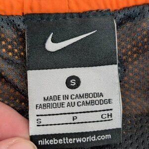 These swim trunks by Nike are made of 100% polyester in dark grey, orange, and white. The trunks have an elastic waist with a front tie, 2 front pockets, and a black inner net to keep everything in place. There is a Nike logo on the outer left leg and a swoosh in the middle of the orange stripe on the back. There is normal wear, but no issues affecting wearability.