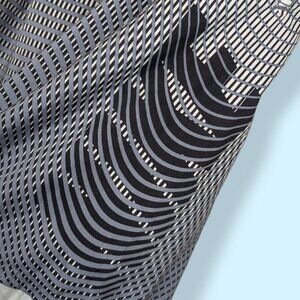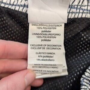 These swim trunks by Nike are made of 100% nylon and are white with grey striped gradient pattern. The trunks have an elastic waist and front tie, a single front pocket, and an inner net that extends down to the bottoms of the legs (instead of being more like briefs). There is normal wear, but no issues affecting wearability.