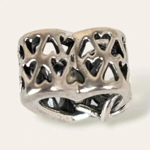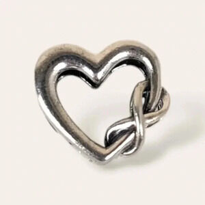 This mom infinity heart charm by Pandora features a sterling silver heart with an infinity symbol wrapped around it on either side. One side says, "Love you mom". The frame of the heart has small heart cutouts on the top and bottom. This charm is stamped S925 ALE on one side and is in good condition. There are some wear marks from time and movement but nothing significant.