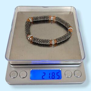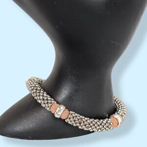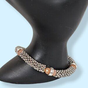 This bracelet is made of silver tone metal and stretches to open. The silver tone links are like little bumps fitted side by side, and are accented by small, faceted peach glass beads and white rhinestones. The bracelet has wear throughout, but weirdly it works with the colour palette. Please see the pictures to see the level of wear.