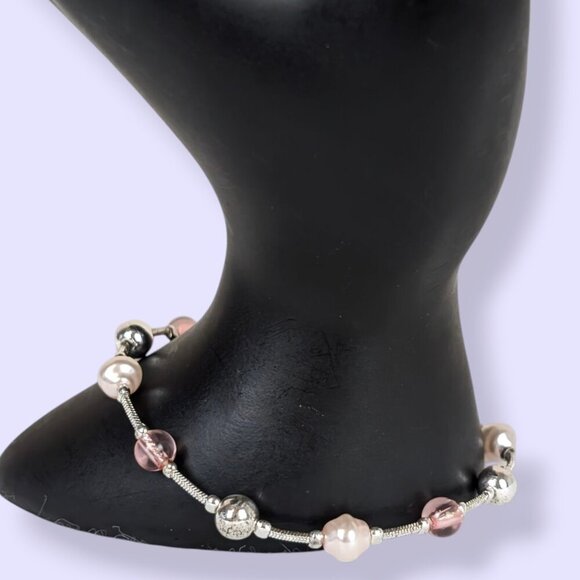 This bracelet is made of a silver tone metal and has a lobster clasp closure. The bracelet features a sturdy snake chain accented in even intervals by 3 types of plastic beads: clear pink spheres, silver metallic spheres, and white-pink faux freshwater pearls. The piece is lightweight and can be worn alone or as part of a stack. There is normal wear.