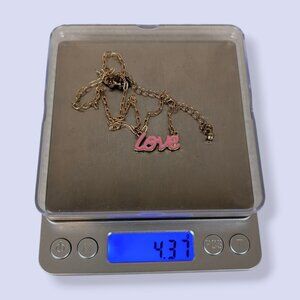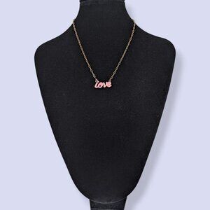 This necklace is made of a gold tone metal and has an adjustable lobster clasp closure. The necklace chain has long squared links, similar to a paperclip chain. The front of the necklace has the word "love" written in a script-like font, filled in with pink enamel. The necklace has normal wear, including tone darkening in the metal, but is still very wearable.