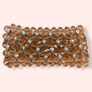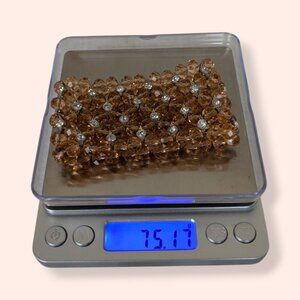 This cuff bracelet is beaded and stretches instead of having an opening/closure. The cuff is wide and features faceted round pink beads and white/clear rhinestones in silver tone metal bezels beaded together in floral shapes with little cut out areas. The bracelet has a nice weight to it and moves easily on the wrist without grabbing and pulling out all the little hairs it can reach. There is some wear to the metal inside the cuff from wear, but this bracelet is in good condition. There are no chipped, damaged, or missing stones or glass beads.