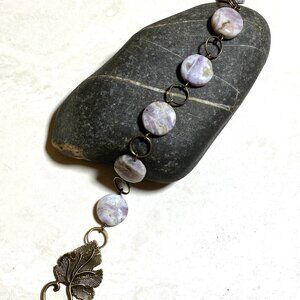 Purple Opalized Fluorite Bracelet, Genuine Gemstone + Bronze Grape Leaf