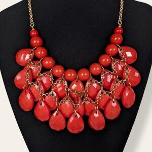 This necklace is made of a gold tone metal and has an adjustable lobster clasp closure. The necklace features a bib-style front with red faceted plastic beads dangling down, and a row of spherical beads at the top. There is little wear, and there are no issues affecting wearability.