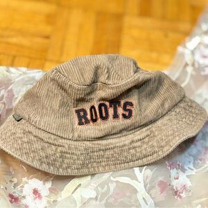 Stylish tan corduroy bucket hat with 'Roots' logo. Perfect for casual outings.