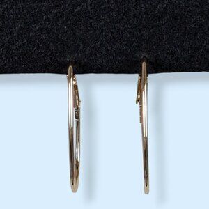 These hoop earrings are made of a gold tone metal and have hinged post findings. The hoops are not circular, but closer to rectangular with a rounded bottom. There is normal wear, but no issues affecting wearability.