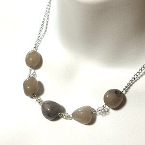 Handmade necklace featuring polished natural agate stones in earthy beige with a hint of lavender-gray tones. Each irregular tumbled stone bead is linked with silver-tone wired flowers and suspended on a delicate chain, creating a simple yet organic style. The stones have a smooth, glossy finish with natural variations, making each piece unique.