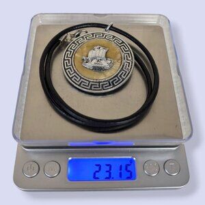 This necklace features a black cord and has a (very short, adjustable) silver tone metal lobster clasp closure. The pendant is round and made of a silver tone metal, with an image on either side, surrounded by a Greek key. The first side of the pendant features the Ship of Theseus, and the second features a male figure, maybe Theseus himself. Both images have a yellow mother of pearl-like textured background. I'm not 100% sure of what the material actually is. The necklace has normal wear throughout, but no issues affecting wearability.