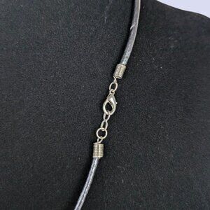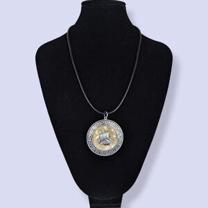 This necklace features a black cord and has a (very short, adjustable) silver tone metal lobster clasp closure. The pendant is round and made of a silver tone metal, with an image on either side, surrounded by a Greek key. The first side of the pendant features the Ship of Theseus, and the second features a male figure, maybe Theseus himself. Both images have a yellow mother of pearl-like textured background. I'm not 100% sure of what the material actually is. The necklace has normal wear throughout, but no issues affecting wearability.