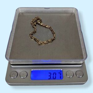 This bracelet is made of a gold tone metal and has an adjustable lobster clasp closure with a white/clear rhinestone at the end of the adjustable chain. The bracelet is quite minimalist and is made of short, small rectangular links. The bracelet has normal wear, but no issues affecting wearability.