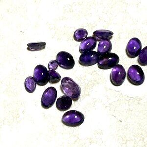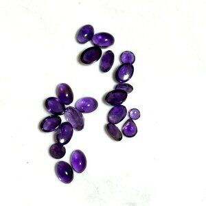 There are 21 tiny genuine high-quality amethyst faceted stones & cabochons in this small bottle.