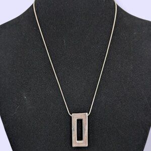 This contemporary necklace is made of a silver tone metal and has an adjustable lobster claw closure. The necklace features a snake chain with tight links and a rectangular pendant with the center cut out. While it isn't stamped, the pendant has the weight and feel of sterling silver. The necklace has normal wear throughout but nothing that affects wearability. Please see the photos to see the level of wear present.