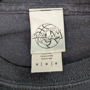 This t-shirt is made of 100% cotton and is black with short sleeves. The shirt features one of my favourite graphics: a 3x3 grid of colourful portraits of the characters from Space Jam, with the logo in the center. The shirt has normal wear, including some fuzzies around the neck that were shaved, but no issues affecting wearability.