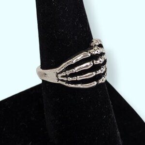 This ring is made of a silver tone metal and has a fixed-size band. The front of the ring is shaped like a boney skeleton hand with tine skulls as knuckles. There is normal wear, but no issues affecting wearability.
