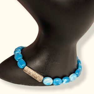 This bracelet is beaded and is strung with an elastic cord. There are two types of beads on the bracelet: small blue and white ovals, and a long silver tone plastic bead that says PEACE. There are also 2 dangling silver tone plastic charms that look like coins. One says St. Anthony and has his picture, and the other says HOPE. There is normal wear, most visible as superficial marks and some cloudiness in the silver tone beads/charms, but the bracelet is still very wearable.
