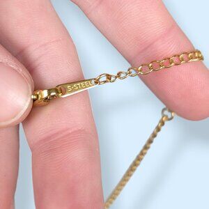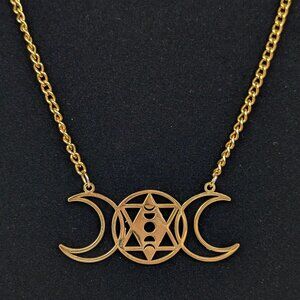 This necklace is made of stainless steel with a gold tone coating and has a small lobster clasp closure, stamped "S. Steel". The chain is standard and sturdy and attaches to the pendant on either side of its top. The pendant is shaped like the outline of 3 moon phases representing the triple goddess. In some cases, this symbol is used in reference to Lilith. The necklace has little wear, if any.