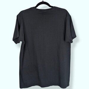 This t-shirt by Sun Records x Elvis is made of 100% cotton and is black with short sleeves. The front of the shirt has a bright yellow, brown, and white graphic that shows Elvis with his guitar in front of a Sun records background, that says, "WHERE ROCK & ROLL WAS BORN" below. There is some wear, but no issues affecting wearability.