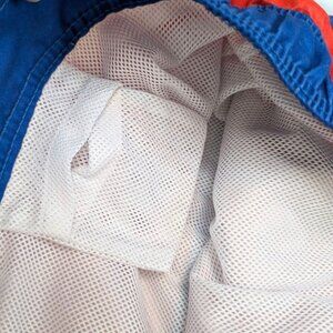 These Superman swim trunks are made of 100% polyester and are red and blue striped with the Superman logo at the bottom on the left side. The shorts have a velcro opening and front tie with elastic in the back. There is a white inner net pocket for keys) and a white net lining to keep everything in place. There is normal wear, but no issues affecting wearability. That said, picture 5 shows a faint white vertical line where a thread has pulled. If you zoom in to picture 2, you can see just how hard it is to spot if you're not already aware of it. It's not a significant issue, but worth mentioning.