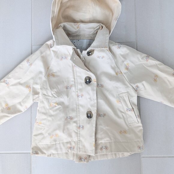 From the Party Collection. Protect them from the rain in sweet style with this hooded coat featuring an allover bicycle print, soft jersey body lining, a shirt collar and front button closure.