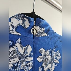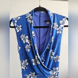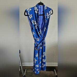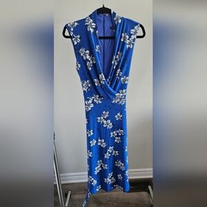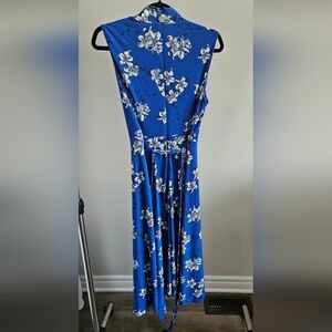 Beautiful royal blue midi dress with white flowers. It's in excellent condition and very comfortable. The matching tie belt is made of the same fabric as the dress and can be removed. This dress has a nice stretch to it.