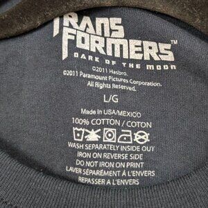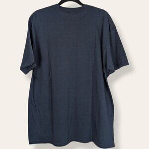This t-shirt is made of 100% cotton and is a dark blue with short sleeves. Made in 2011, this shirt features a large simple graphic on the front of the letters "TF". The letters are grey, conjoined, and stylized like stone or metal. The shirt has normal wear, but no issues affecting wearability.