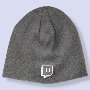 This toque by Twitch is made of 100% acrylic and is knit in a grey tone. There are two patches of embroidery done in white thread: the front of the toque says "twitch" and the back has the little square-ish Twitch logo. The embroidery can be seen on the interior as well (though reversed).