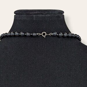 This vintage necklace is beaded and has a c clasp closure made of a silver tone metal. The beads are spherical and made of black plastic, and are affixed directly to the string. They graduate gently from front to back. The necklace has normal wear, including superficial marks in the surface of the beads. It is a bit basic so it can easily be worn alone or as part of a stack.
