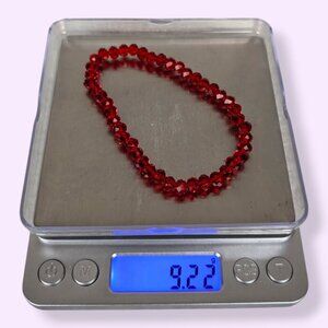 This vintage bracelet is strung on an elastic cord and does not have an opening. The bracelet features small red faceted transparent glass beads all the way around. There is normal wear, but no issues affecting wearability. There are no beads that are chipped, cracked, or otherwise broken.