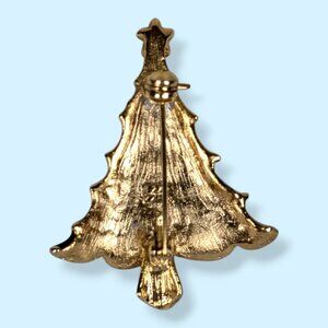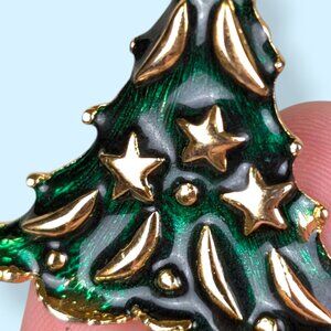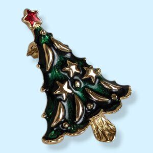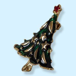 This vintage brooch (stamped AAI or Ali) is made of a gold tone metal and has a modern locking c pin closure. The brooch is shaped like a christmas tree (or non-descript conifer with a star on top) and is filled in with green and red enamel. The colour comes across as very dark on camera, but pic 4 shows a close up where you can see that the colour is a little more vivid. The brooch has normal wear, but no issues affecting wearability.