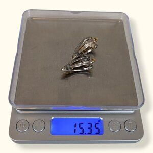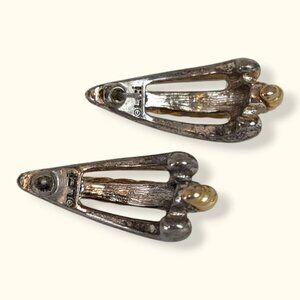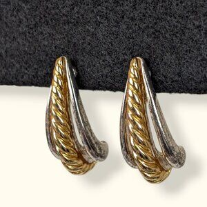 These vintage earrings by Liz Claiborne (LCI) are made of silver and gold tone metals and have simple post backings. The earrings are tapered and each have 3 strands that flare out towards the bottom. The exterior strands are silver toned and smooth, and the center strand is gold toned and has a rope-like twisting detail. The backs of the earrings are stamped LCI (Liz Claiborne). The earrings have normal wear throughout including tone change on the backs and superficial marks in the surface of the metal, but the pair is still very wearable.