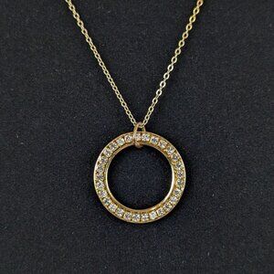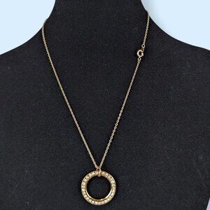 This vintage necklace is made of a gold tone metal and has a c clasp closure. The chain is lightweight and dainty, and the pendant hangs from a large jump ring. The pendant is round and has its center cut out, with the remaining area on the front covered in small white/clear rhinestones. The back is smooth and without design. There is normal wear, but no issues affecting wearability.