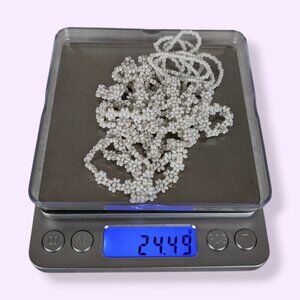 This vintage necklace is a chain of small beaded white flowers with 3 beaded loops on either end. The necklace doesn't have a closure, but rather can be tied in the front, looped through itself, or left to hang as pictured. It may also be long enough to wear as an accent belt, should you so desire. There is normal wear, including a bit of a vintage smell that has permeated the fabric cord, but no issues affecting wearability.