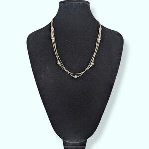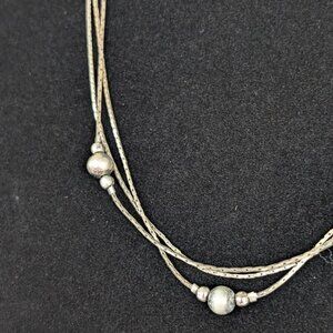 This vintage necklace is made of a silver tone metal and has a lobster clasp closure. The necklace has 3 strands made up of thin, flat herringbone-like chains. The necklace is accented by 7 small dark balls, each of which have a smaller bead on either side. The beads are cold to the touch and might be some kind of metal, but I'm not certain of that. The necklace has normal wear throughout, but no issues affecting wearability.
