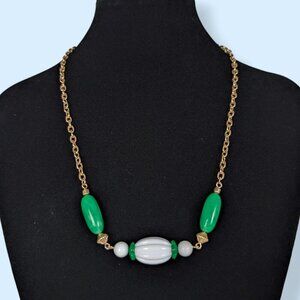 This vintage necklace by Avon comes to us from the 1970s and has an adjustable hook closure (and stamped maker's tag) made of a gold tone metal. While it may appear silver tone (pic 4), that's just the lighting. The necklace has a standard chain from the clasp forward, and is accented by green and white beads at the very front. There is normal wear, including some tone darkening towards the back, but no issues affecting wearability.
