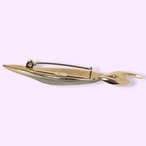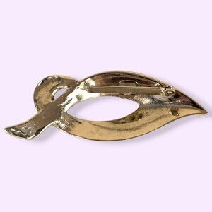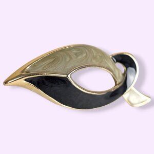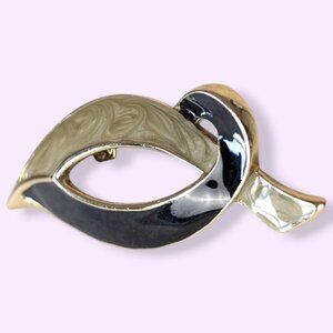 This vintage brooch is made of a gold tone metal and has a modern locking c pin closure. The brooch is shaped like a ribbon folding over itself and is accented by black enamel on the bottom and a swirling white enamel on the top. There is normal wear throughout, but no issues affecting wearability.