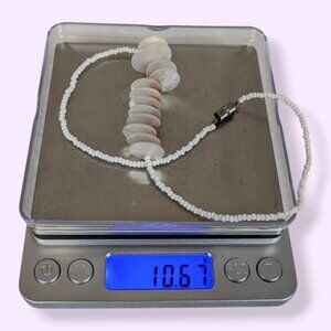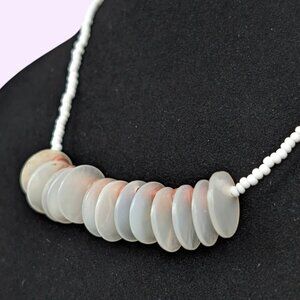 This vintage necklace is beaded and has a barrel clasp made of a silver tone metal. The necklace is strung with small white beads from the clasp to the front, which alternates between round, flat shell discs and small pink/coral beads (which may be shell or coral). The shell discs are (mostly) sitting flat in the pictures, but they do seem to like spinning a bit during wear. There is normal wear throughout, but no issues affecting wearability.