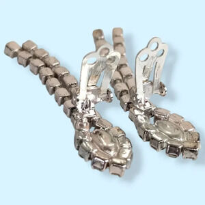 These vintage earrings are made of silver tone metal and have clip on backings. Each earring features a medium-sized navette white/clear rhinestone with small stones that circle it and dangle down, sort of like hair around a face. There is some tone loss/change in the metal on the back, but not the front, and the rhinestones are all living and good.