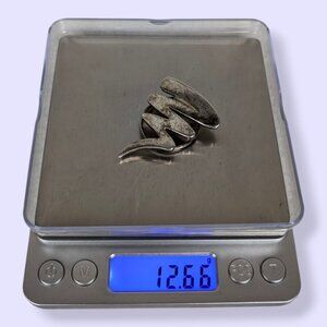 This vintage clip is made of a silver tone metal and has a hinged loop on its back. The front of the clip is shaped like something halfway between a lightning bolt and a squiggle, and has tone change/loss/darkening/distress throughout. While this kind of "distress" would normally ruin a piece, there's something about this clip that makes the distress work. The piece has wear throughout but is still functional and wearable, please see the pictures!
