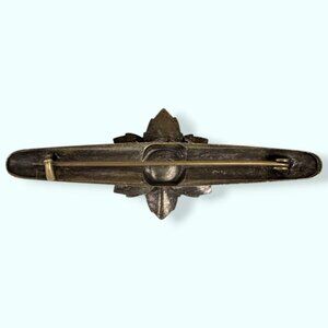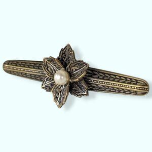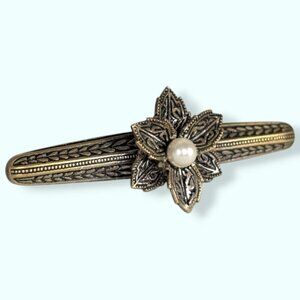 This vintage bar brooch is made of a gold tone metal and has what appears to be an early locking pin closure I haven't seen before. The brooch has black horizontal detailing across the bar in a Damascene-like style, with a 6-petal flower in the center. The petals have similar black details, and there is a nice round faux pearl in the center. The brooch has some wear, but no issues affecting wearability.