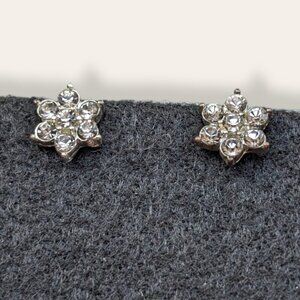 These vintage earrings are made of a silver tone metal and have simple post findings. Each earring is shaped like a 6-point flower (or snowflake?) with a total of 7 small white/clear glass rhinestones. Picture 2 shows the clarity of the stones in indirect daylight. The earrings have normal wear, but no issues affecting wearability. There are no missing or dead stones.