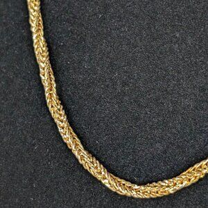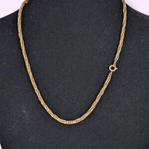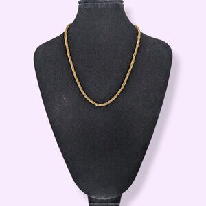 This vintage chain necklace is made of a gold tone metal and has a c clasp closure. The chain is like a long, twisted rectangle with a herringbone link pattern. The chain has normal wear but is in good condition overall.